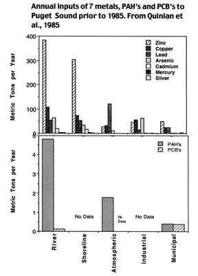 In past decades Puget Sound sediments, water and biota were considerably more contaminated, and over a larger area, than they are today. Dated sediment cores reveal that the bottom of Puget Sound was clean until just after the turn of the century. The most contaminated period was between World War II and about 1960 when many kinds of metals and organic chemicals were discharged and spread through the shallow and deep waters of the Main Basin. Laws and enforcement actions during the 1960's began to reverse this trend. Pulp mills reduced their waste inputs by factors of 10 or more. During the 1970's pre-treatment, source controls and bans on chemicals such as DDT , PCB's and leaded gasoline caused further and dramatic reductions in the amounts of contaminants entering the Sound. Actions during the 1980's and 1990's help control contaminant inputs from old plumbing, hazardous waste sites and other hot spots. During the late 1980's and into the 1990's increased levels of wastewater treatment were implemented.