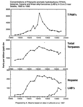 Hopane is a natural non-degradable chemical in oil and fuel and may mark the cumulative history of oil and fuel spills, again peaking in the 1940-60 era and declining slowly since.